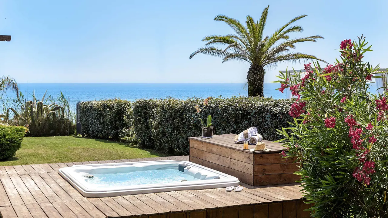 Seafront view, located on the ground floor with large private patio with hot tub, in an annex building, separate from the main structure, offering maximum privacy and tranquility.
